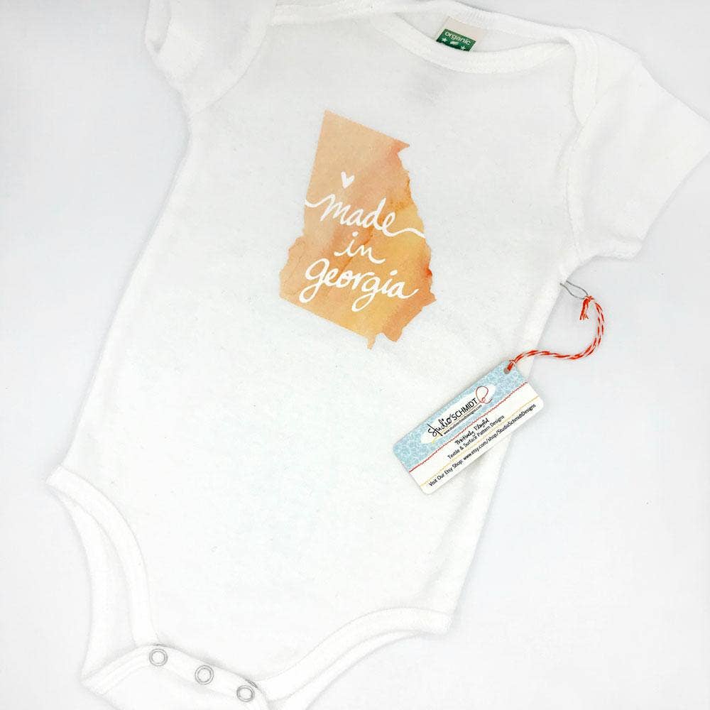 You'll love this super soft, organic cotton "Made In Georgia" baby onesie, which coordinates with our "Peachy Keen" peach-themed organic cotton baby collection! Perfect for Georgia babies, and available in sizes 0-3M through 12-18M, our baby bodysuits are made in the USA and feature a lapped neckline and 3 metal snaps.